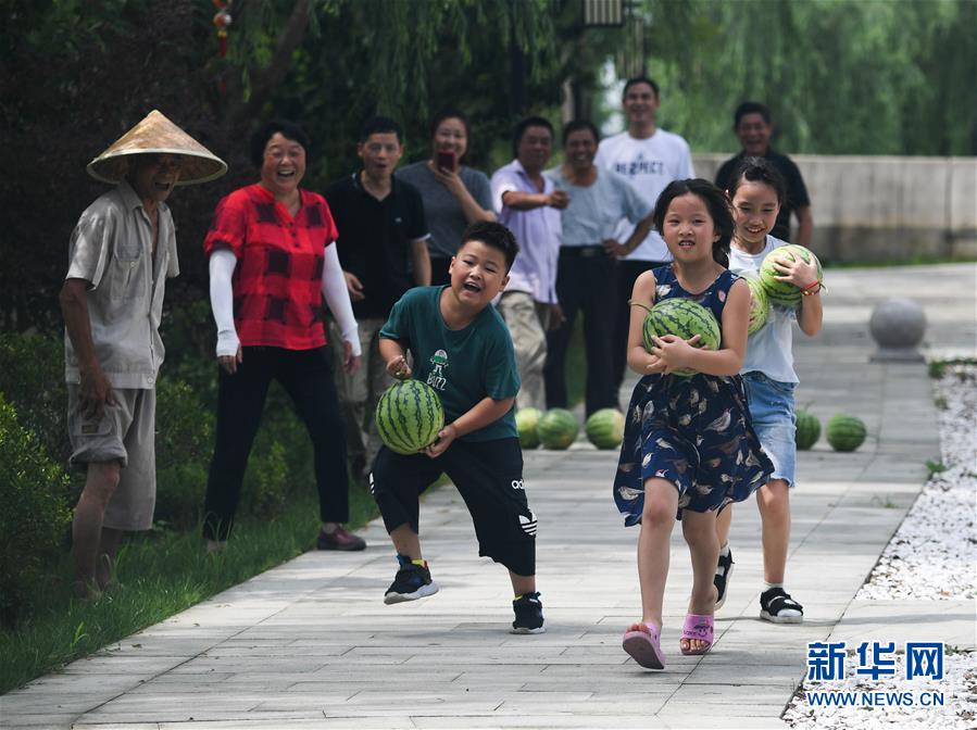 7月22日,廟兜村的孩子們?cè)诒荣惓晕鞴稀.?dāng)日是大暑節(jié)氣,浙江省湖州市吳興區(qū)織里鎮(zhèn)廟兜村舉行了趣味“賽西瓜”比賽,迎接這個(gè)“火熱”的節(jié)氣。廟兜村種植有500多畝西瓜,目前正值西瓜豐收的時(shí)節(jié),村民們用“賽西瓜”的形式,感受豐收的喜悅。新華社記者徐昱攝
