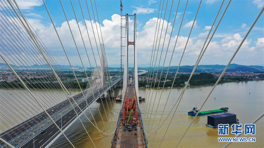 7月22日拍攝的廣州南沙港鐵路跨西江特大斜拉橋最后一組斜拉索吊裝現(xiàn)場(chǎng)(無(wú)人機(jī)照片)。新華社記者劉大偉攝