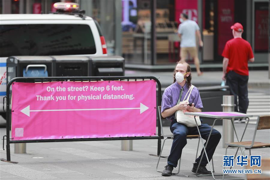 7月23日,在美國(guó)紐約時(shí)報(bào)廣場(chǎng),人們從保持社交距離的提示牌旁走過(guò)。美國(guó)約翰斯·霍普金斯大學(xué)23日發(fā)布的新冠疫情最新統(tǒng)計(jì)數(shù)據(jù)顯示,美國(guó)累計(jì)確診病例超過(guò)400萬(wàn)例。數(shù)據(jù)顯示,截至美國(guó)東部時(shí)間23日15時(shí)34分(北京時(shí)間24日3時(shí)34分),美國(guó)累計(jì)確診病例4007859例,累計(jì)死亡病例143846例。新華社記者王迎攝
