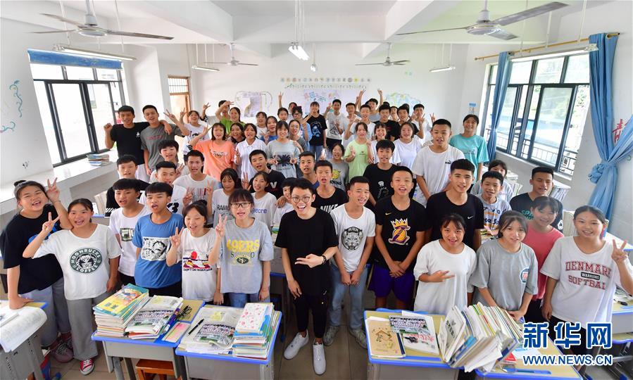 在融水苗族自治縣丹江中學(xué)1708班舉辦的送別班會(huì)上,支教老師溫昌浩(前排居中黑色衣服)和同學(xué)們合影(7月23日攝)。新華社記者黃孝邦攝