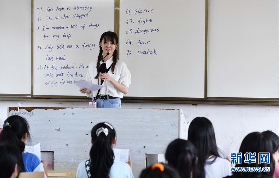 在融水苗族自治縣民族中學(xué)1818班舉辦的送別班會(huì)上,支教老師高潔給同學(xué)們上最后一節(jié)英語課(7月23日攝)。新華社記者黃孝邦攝