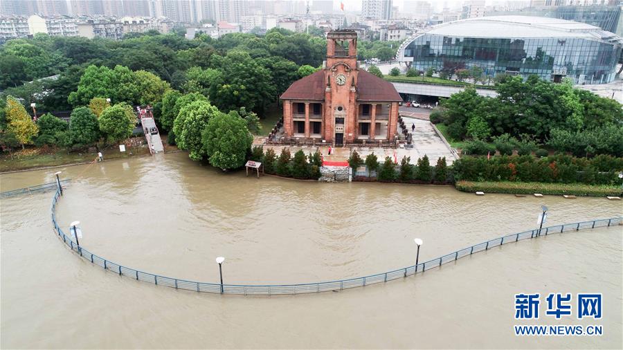 蕪湖市標(biāo)志性建筑之一老海關(guān)前的觀景平臺已被江水淹沒(7月25日攝,無人機(jī)照片)。新華社記者 曹力 攝