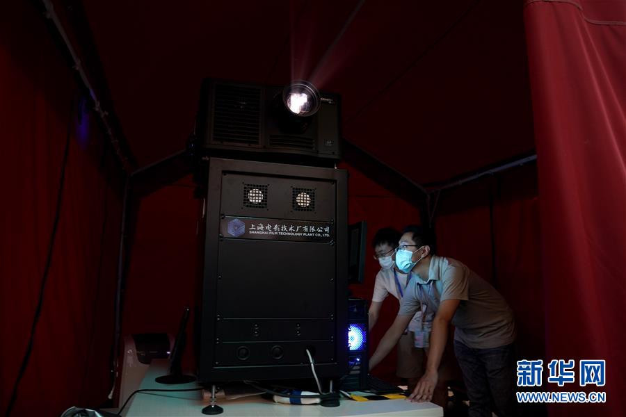 7月25日,在上海大寧音樂廣場的露天電影展映現(xiàn)場,放映人員在工作。新華社記者 劉穎 攝