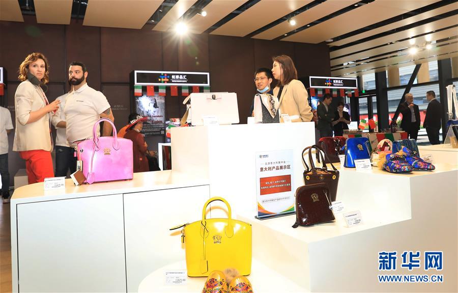 2020年5月8日,虹橋品匯國別文化節(jié)云游意大利主題展在上海虹橋進(jìn)口商品展示交易中心舉行,參觀者從展覽上一個(gè)意大利皮具展示臺(tái)前走過。新華社記者 方喆 攝