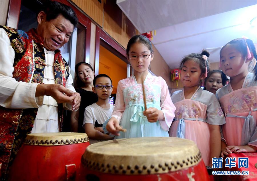 7月26日,在石家莊市橋西區(qū)休門街道休門西街社區(qū),休門吹歌傳承人付錫芬(左一)在指導(dǎo)小朋友敲鼓技巧。當(dāng)日,河北省石家莊市橋西區(qū)暑期“非遺”小課堂開班。河北省級非物質(zhì)文化遺產(chǎn)休門吹歌傳承人走進休門街道休門西街社區(qū),為轄區(qū)小朋友講解休門吹歌歷史,傳授非遺技藝,豐富他們的暑期生活。新華社記者 王曉 攝