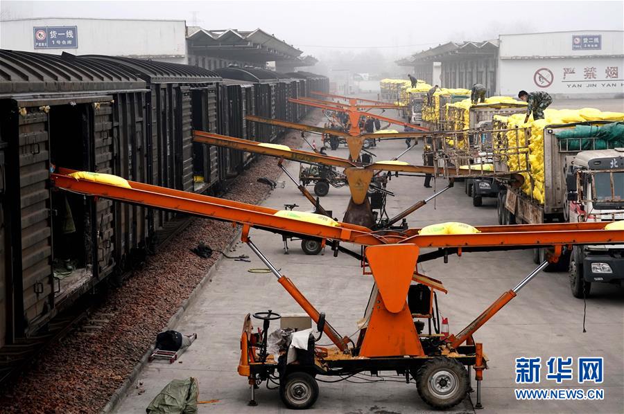 在中國(guó)鐵路鄭州局集團(tuán)有限公司開封車站,工作人員使用傳輸機(jī)裝運(yùn)春耕物資(2月13日攝)。新華社記者 李安 攝