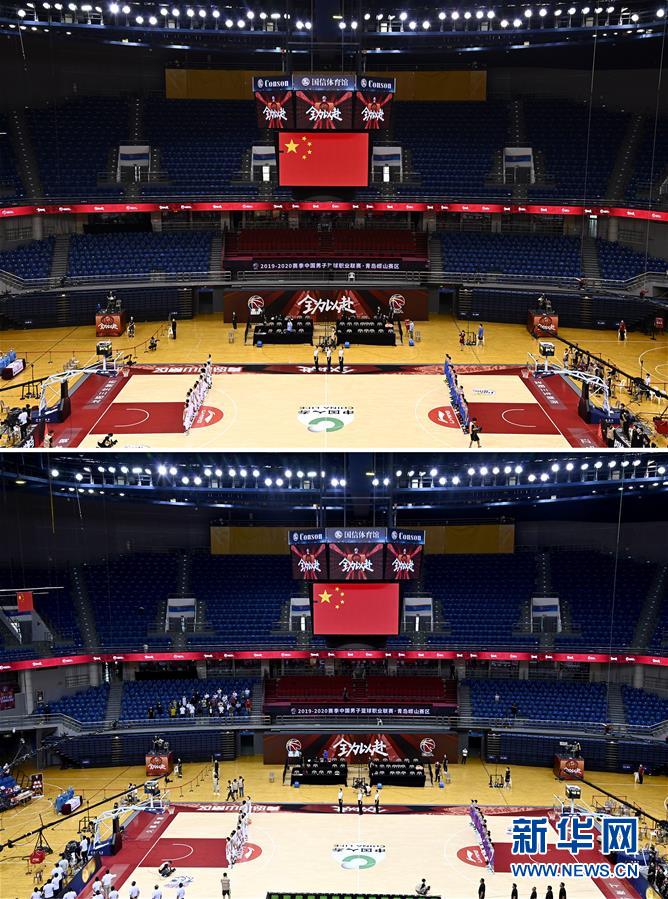 拼版照片的上圖為7月26日遼寧本鋼隊對陣四川五糧金樽隊的比賽現場;下圖為7月26日上海久事隊對陣山東西王隊的比賽現場,該場比賽首次恢復觀眾現場觀看比賽。當日,在山東青島舉行的2019-2020賽季中國男子籃球職業(yè)聯(lián)賽(CBA)復賽第二階段(嶗山賽區(qū))比賽中,醫(yī)護人員、教師、公安戰(zhàn)線人士通過官方購票平臺,完成包括核酸檢測在內的相關流程后進場觀看了上海久事隊迎戰(zhàn)山東西王隊的比賽。觀賽期間,觀賽者須全程佩戴口罩,對號入座,嚴格保持間隔一米就座。退場時,觀眾須按照自后向前、先兩邊后中間的順序,保持“一米線”社交距離有序退場。新華社記者 郭緒雷 攝