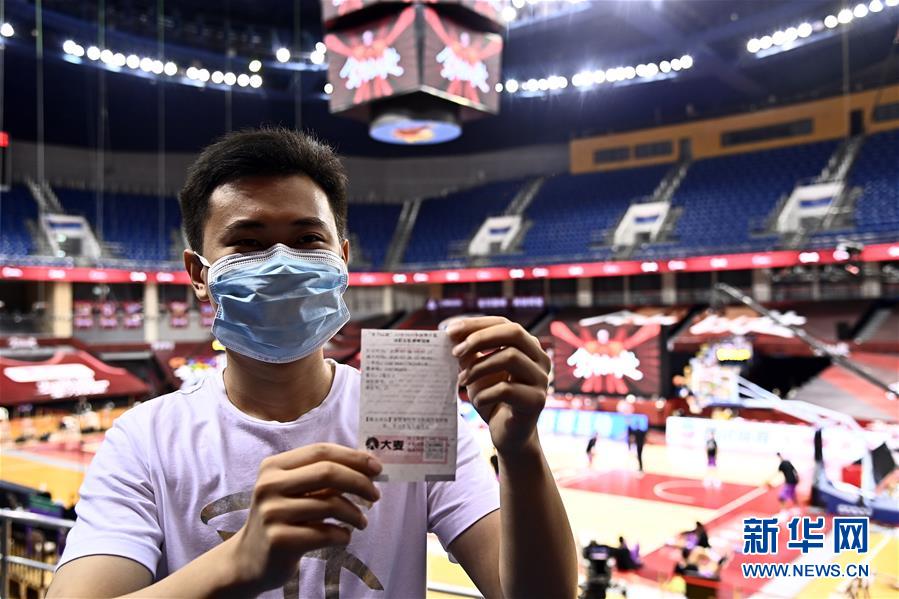 7月26日,在青島國信體育館,蘇柯帆展示著自己的紙質球票。他成為CBA聯(lián)賽復賽允許觀眾現場觀賽后,首位進場的觀眾。當日,在山東青島舉行的2019-2020賽季中國男子籃球職業(yè)聯(lián)賽(CBA)復賽第二階段(嶗山賽區(qū))比賽中,醫(yī)護人員、教師、公安戰(zhàn)線人士通過官方購票平臺,完成包括核酸檢測在內的相關流程后進場觀看了上海久事隊迎戰(zhàn)山東西王隊的比賽。觀賽期間,觀賽者須全程佩戴口罩,對號入座,嚴格保持間隔一米就座。退場時,觀眾須按照自后向前、先兩邊后中間的順序,保持“一米線”社交距離有序退場。新華社記者 郭緒雷 攝