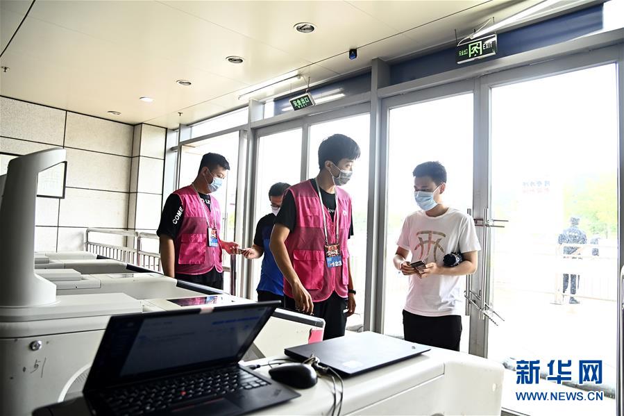 7月26日,在青島國信體育館,蘇柯帆(右)正在進場。他成為CBA聯(lián)賽允許觀眾現場觀賽后,首位進場的觀眾。當日,在山東青島舉行的2019-2020賽季中國男子籃球職業(yè)聯(lián)賽(CBA)復賽第二階段(嶗山賽區(qū))比賽中,醫(yī)護人員、教師、公安戰(zhàn)線人士通過官方購票平臺,完成包括核酸檢測在內的相關流程后進場觀看了上海久事隊迎戰(zhàn)山東西王隊的比賽。觀賽期間,觀賽者須全程佩戴口罩,對號入座,嚴格保持間隔一米就座。退場時,觀眾須按照自后向前、先兩邊后中間的順序,保持“一米線”社交距離有序退場。新華社記者 郭緒雷 攝