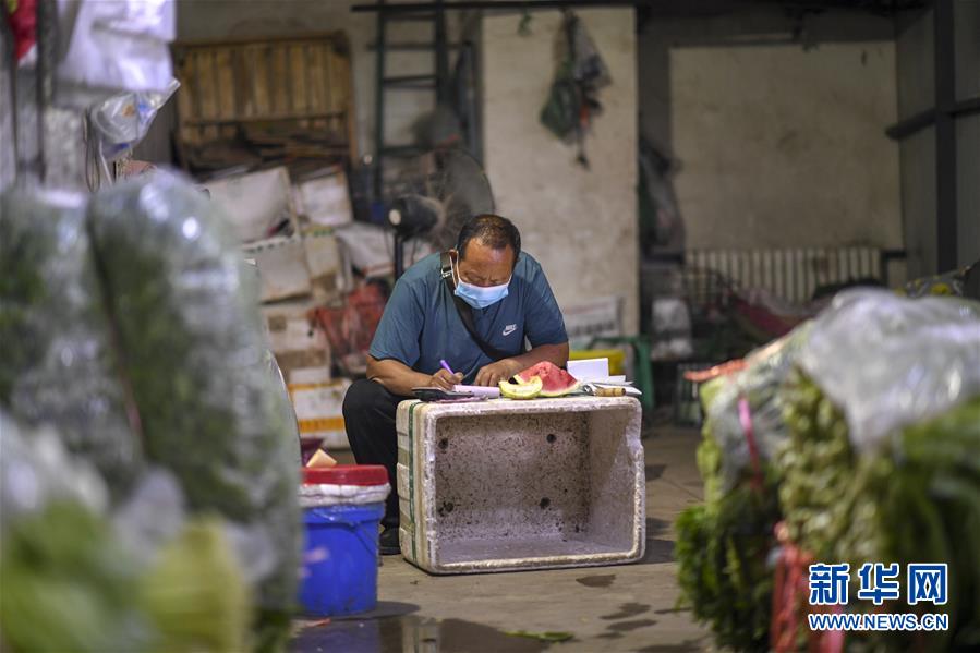 7月26日,在烏魯木齊新聯(lián)農(nóng)副產(chǎn)品綜合市場內(nèi),商販在計(jì)算一天的收入。新華社記者 趙戈 攝