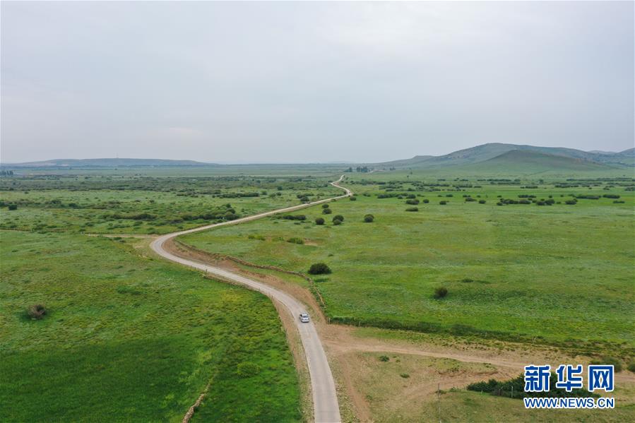 呼格吉勒和妻子薩如拉、女兒蘇日娜駕車從牧區(qū)的家前往旗里的新房(7月26日攝,無人機照片)。新華社記者徐欽攝
