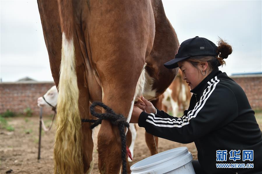 呼格吉勒的妻子薩如拉在擠奶(7月26日攝)。新華社記者劉磊攝