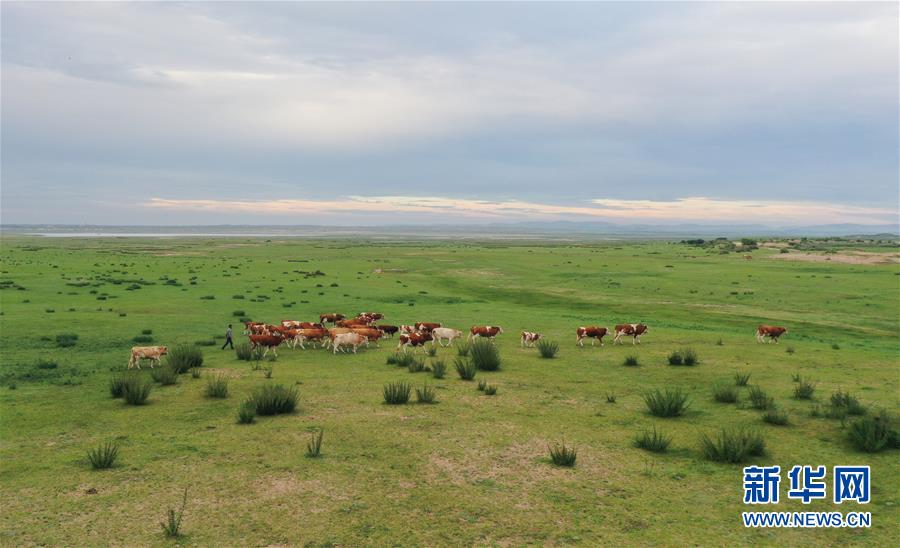呼格吉勒在正藍旗恩克寶力格嘎查的牧場上放牛(7月25日攝,無人機照片)。新華社記者徐欽攝