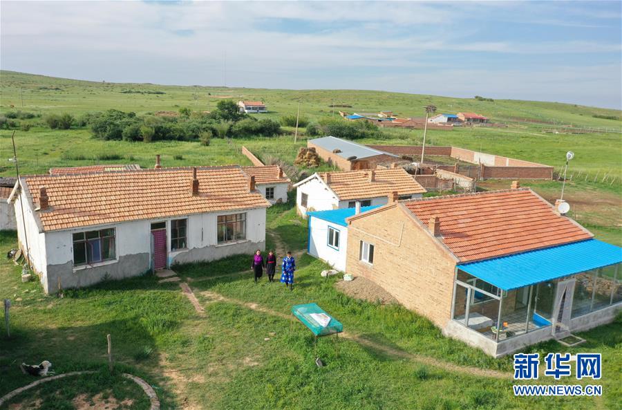 呼格吉勒和妻子薩如拉、女兒蘇日娜走在有舊土坯房和磚瓦房的自家院落里(7月23日攝,無人機照片)。新華社記者徐欽攝