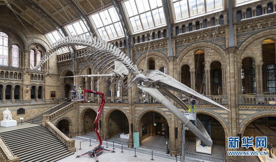 7月27日,工作人員在英國倫敦的自然歷史博物館大廳內(nèi)清潔一具藍鯨骨架。受新冠疫情影響關(guān)閉數(shù)月的英國自然歷史博物館將于8月5日重新對外開放,目前館方正在為重新開放做最后準(zhǔn)備。參觀者需要提前預(yù)約參觀時段、全程佩戴口罩且保持安全距離。新華社記者韓巖攝