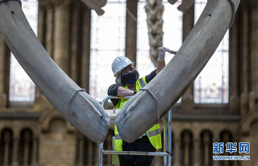 7月27日,一名工作人員在英國倫敦的自然歷史博物館大廳內(nèi)清潔一具藍鯨骨架。受新冠疫情影響關(guān)閉數(shù)月的英國自然歷史博物館將于8月5日重新對外開放,目前館方正在為重新開放做最后準備。參觀者需要提前預(yù)約參觀時段、全程佩戴口罩且保持安全距離。新華社記者韓巖攝