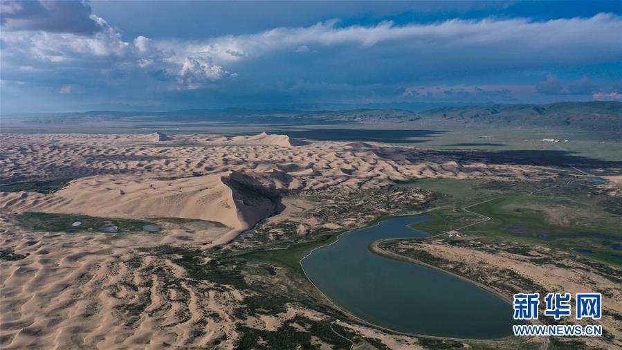 這是7月28日拍攝的青海湖沙島一隅(無人機照片)。盛夏傍晚,位于青海湖東北部的沙島,島內(nèi)湖泊星羅棋布,沙丘連綿起伏,風(fēng)景別致。金沙與湖水掩映,在陽光的勾勒下形成一幅美麗的畫卷。新華社記者吳剛攝