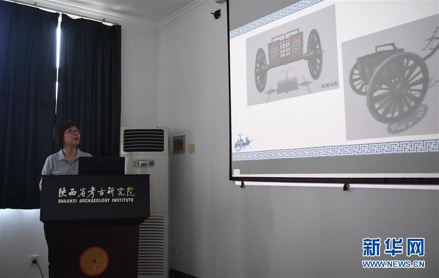 7月30日,在陜西省考古研究院涇渭基地,陜西省考古研究院副研究員黃曉娟介紹西周晚期青銅輪牙馬車(chē)復(fù)原情況。新華社記者李一博攝