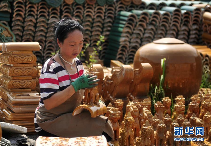 7月30日,河北省任丘市出岸鎮(zhèn)古建磚廠工人在整理制作的仿古建筑裝飾物。新華社記者牟宇攝