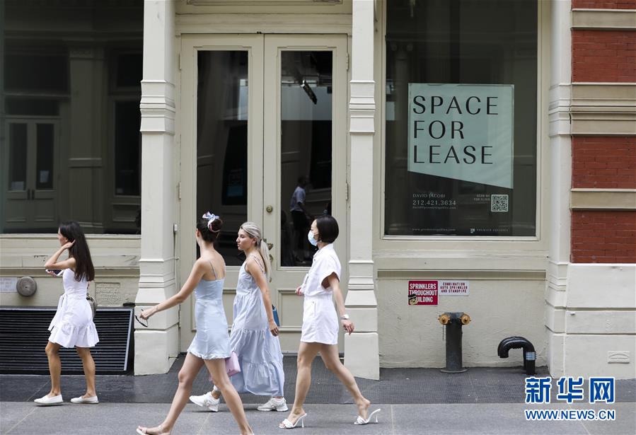 7月30日,在美國(guó)紐約蘇豪商業(yè)區(qū),人們從一家招租的店面旁走過。美國(guó)商務(wù)部30日公布的首次預(yù)估數(shù)據(jù)顯示,受新冠疫情導(dǎo)致經(jīng)濟(jì)大面積“停擺”和消費(fèi)停滯拖累,今年第二季度美國(guó)實(shí)際國(guó)內(nèi)生產(chǎn)總值(GDP)按年率計(jì)算下滑32.9%,創(chuàng)1947年有記錄以來(lái)最大降幅。新華社記者王迎攝