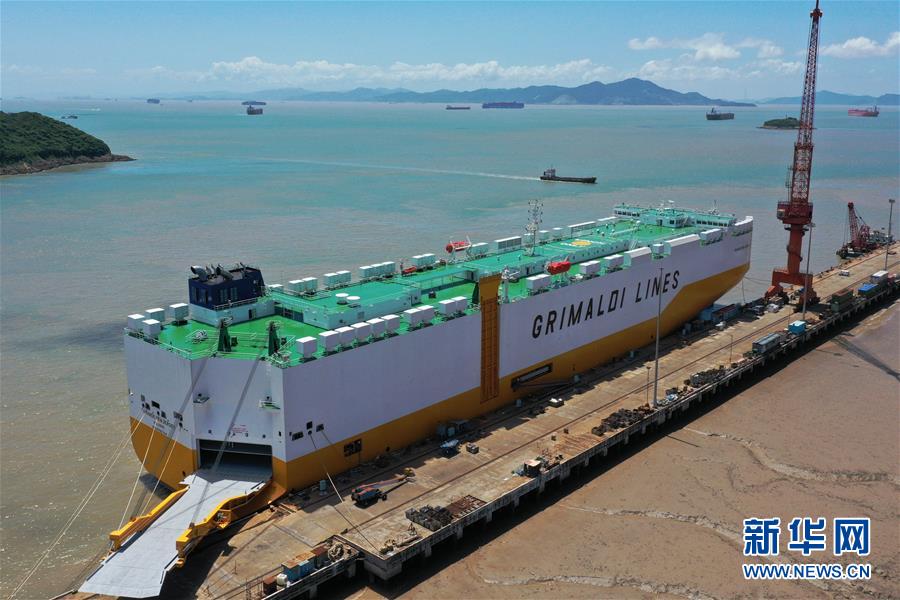 8月1日在位于螞蟻島的揚(yáng)帆集團(tuán)東海岸造船廠拍攝的一艘在建的汽車滾裝船,月底即將交付給意大利客戶(無人機(jī)照片)。新華社記者黃宗治攝