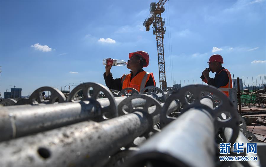 8月3日,工人在長(zhǎng)江文創(chuàng)產(chǎn)業(yè)園項(xiàng)目工地休息喝水。進(jìn)入8月,武漢迎來(lái)持續(xù)高溫天氣。在湖北廣電傳媒基地工程的工地上,中建三局總承包公司1500多名工人持續(xù)奮戰(zhàn),力保工程進(jìn)度。該工程是我國(guó)中部地區(qū)首個(gè)國(guó)家級(jí)廣播影視媒體基地,由湖北廣電傳媒大廈項(xiàng)目、長(zhǎng)江文創(chuàng)產(chǎn)業(yè)園項(xiàng)目、廣電生活配套項(xiàng)目三大板塊組成,總建設(shè)規(guī)模130萬(wàn)平方米。自今年3月25日獲批正式復(fù)工以來(lái),承建方克服困難,把因疫情影響耽誤的工期趕了回來(lái),預(yù)計(jì)將按原計(jì)劃完成建設(shè)任務(wù)。新華社記者程敏攝