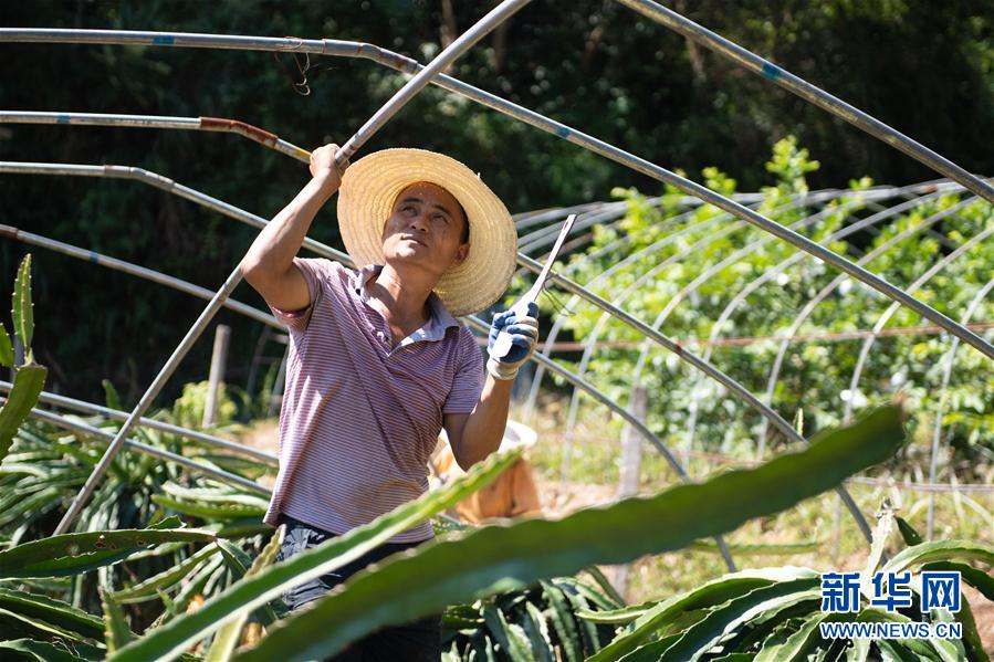 受近期多輪強(qiáng)降水引發(fā)的山洪影響,位于湖南省保靖縣碗米坡鎮(zhèn)首八峒村的易甸園水果有限公司種植基地大棚內(nèi)上百株火龍果枝條受損,當(dāng)?shù)卮迕裾ゾo搶修大棚,降低災(zāi)害損失。新華社記者李鑫攝