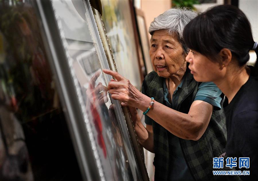 在開封市素花宋繡工藝有限公司的展示館里,王素花向徒弟劉冬紅講解刺繡作品上的難點(7月30日攝)。新華社記者李安攝