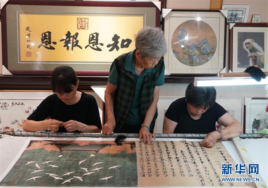 在開封市素花宋繡工藝有限公司的展示館里,王素花(中)在指導徒弟們刺繡(7月30日攝)。新華社記者李嘉南攝