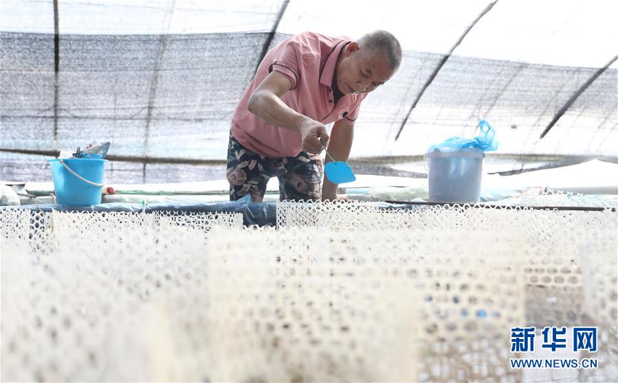 8月4日,張忠堡村村民趙世龍在觀察育種筐里的觀賞魚排卵狀況。新華社記者姚劍鋒攝