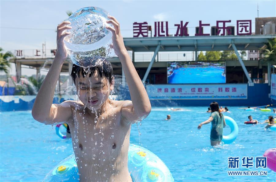 8月5日,重慶涪陵紅酒小鎮(zhèn)水上樂園內(nèi),一名游客用真冰做成的冰桶裝滿水,給自己澆水降溫。當(dāng)日,重慶市氣象臺再次發(fā)布“高溫橙色預(yù)警信號”,重慶大部分海拔400米以下地區(qū)日最高氣溫將升至37℃以上,局地可達(dá)40℃以上。許多重慶市民涌進(jìn)當(dāng)?shù)氐乃蠘穲@和泳池,在水中享受夏季的清涼。新華社記者劉潺攝