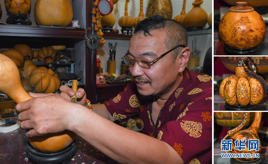 這是一張拼版照片。左:8月5日,侯景偉在葫蘆上進行創(chuàng)作。右:侯景偉創(chuàng)作的葫蘆工藝品(8月5日攝)。今年55歲的吉林四平人侯景偉自幼與家人學(xué)習(xí)雕刻、烙畫藝術(shù)。經(jīng)過多年潛心研究,他將浮雕和烙畫工藝相結(jié)合,通過拋光、起稿、雕刻、烙燙、套色等十余道工藝,制作展現(xiàn)傳統(tǒng)文化、民俗故事的葫蘆工藝品。2020年,侯景偉被評為四平市非物質(zhì)文化遺產(chǎn)項目侯氏葫蘆雕刻烙畫代表性傳承人。他說:“希望有更多人加入到非遺傳承隊伍中,讓小葫蘆‘講’出更多民俗故事。”新華社記者張楠攝