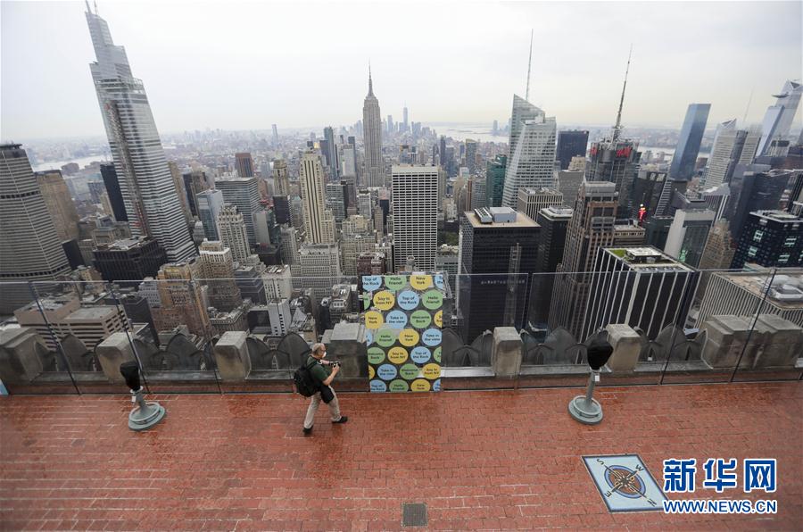 8月6日,在美國紐約,一名攝影師在洛克菲勒中心觀景臺(tái)上參觀。當(dāng)日,3月份暫時(shí)關(guān)閉的洛克菲勒中心觀景臺(tái)恢復(fù)對公眾開放。每天13時(shí)至21時(shí),人們可戴口罩前往參觀。新華社記者王迎攝