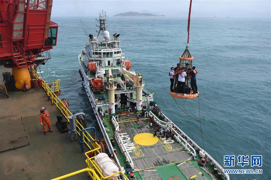 7月10日,工人乘船抵達位于南海北部海域的勘探三號鉆井平臺附近,再乘坐由吊機牽引的吊籠登上鉆井平臺,開啟他們當期在勘探三號平臺上的輪值工作。新華社記者蒲曉旭攝