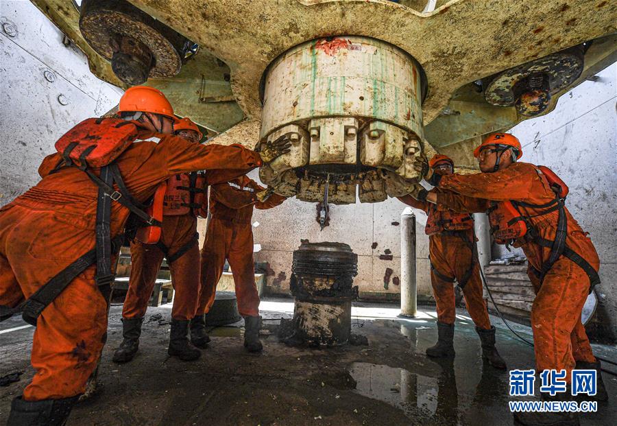 7月26日,在位于南海北部海域的勘探三號鉆井平臺上,鉆井工人在擺放鉆桿。新華社記者蒲曉旭攝