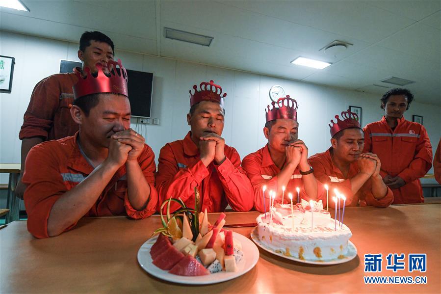 7月22日,在位于南海北部海域的勘探三號鉆井平臺上,4名鉆井工人在平臺餐廳里過集體生日。新華社記者蒲曉旭攝