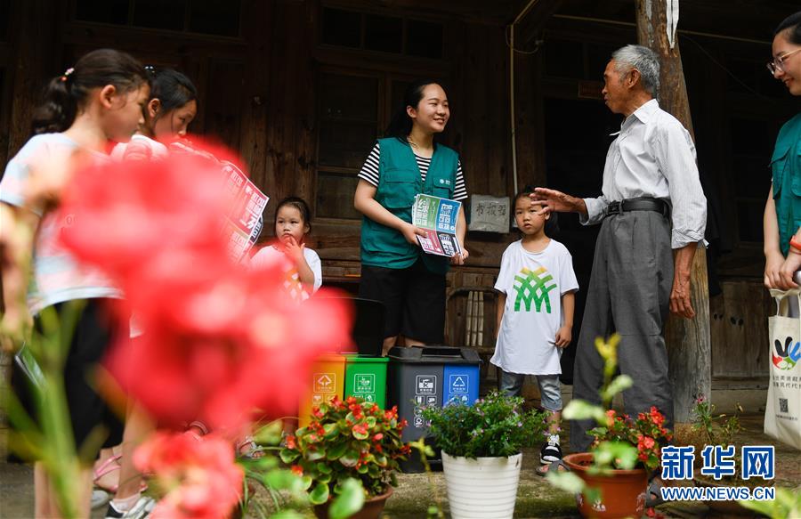 寧波市奉化區(qū)的小草志愿服務(wù)隊(duì)志愿者(中)在大堰鎮(zhèn)箭嶺村向村民和小學(xué)生講解垃圾分類的方法(2019年6月30日攝)。近年來(lái),浙江省通過(guò)創(chuàng)新宣傳教育,多措并舉促進(jìn)垃圾分類投放、收運(yùn)及處置的良性循環(huán),引領(lǐng)垃圾分類成為城鄉(xiāng)居民的生活新風(fēng)尚。新華社記者黃宗治攝。