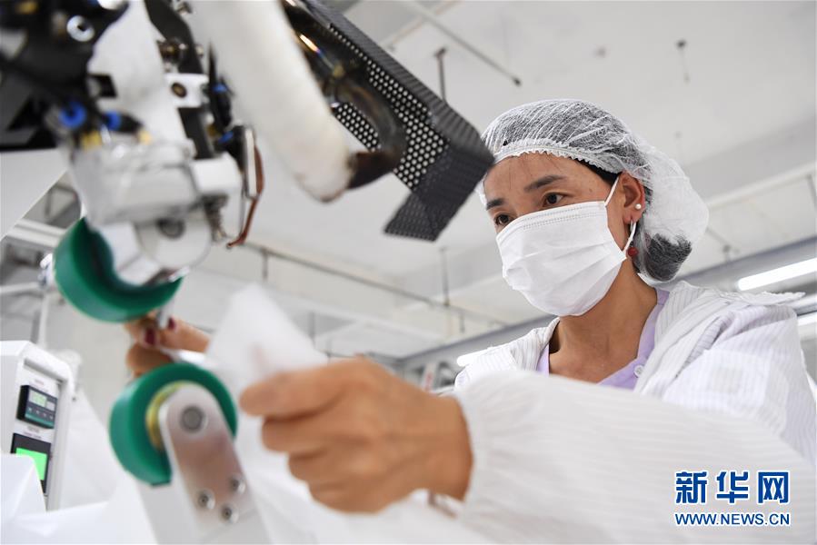 8月9日,甘肅拓奇扶貧車間的員工在服裝加工生產線上作業(yè)。甘肅拓奇扶貧車間位于甘肅省臨夏回族自治州積石山縣,是依托東西部扶貧協(xié)作平臺引進的服裝加工企業(yè)。扶貧車間建成投產以來帶動就業(yè)近300人,其中吸納建檔立卡貧困戶就業(yè)110人,實現(xiàn)了貧困群眾就地就近就業(yè)增收的目的,為助推當?shù)孛撠毠约翱h域經濟發(fā)展發(fā)揮了重要作用。新華社記者邢廣利攝。