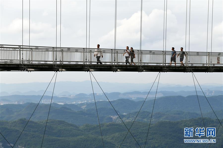 8月8日,游客在貴州省龍里油畫大草原的吊橋上觀光。近日,貴州省黔南布依族苗族自治州龍里縣境內氣候宜人,龍里油畫大草原、“龍門鎮(zhèn)”武俠文化主題景區(qū)等景點吸引眾多游客前來觀光旅游。新華社記者楊文斌攝。