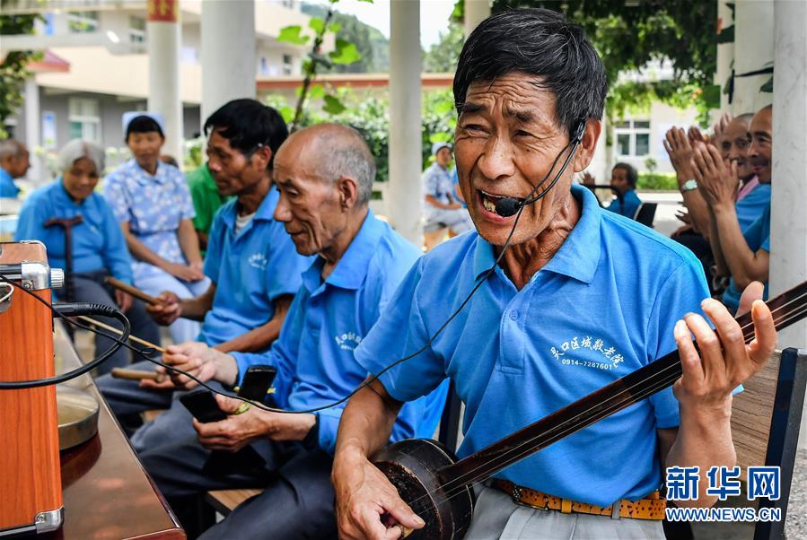 陜西商洛市洛南縣靈口區(qū)域敬老院的老人們在唱靜板書(7月28日攝)。據了解,陜西洛南縣目前共有9所敬老院,設置床位760張,對全縣愿意到敬老院的381名農村特困人員實行集中供養(yǎng)政策。新華社記者劉瀟攝。