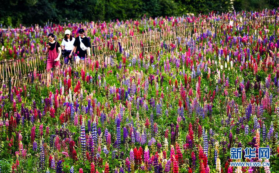 游客在陜西寶雞市太白縣咀頭鎮(zhèn)七里川村的魯冰花產業(yè)園內觀光游覽(7月4日攝)。近年來,陜西地處秦巴山區(qū)的多個縣市結合當地自然氣候條件打造特色花海景觀,利用“花海經濟”助力脫貧攻堅和鄉(xiāng)村振興。新華社記者劉瀟攝。