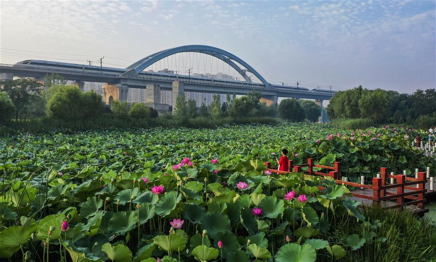 市民在唐山市豐南區(qū)人民公園欣賞荷花(7月25日攝,無人機照片)。近年來,河北省唐山市豐南區(qū)全力推動“全域治水、清水潤城”工程,形成了以唐津運河、人民公園生態(tài)廊道等以健身、休閑、旅游功能于一體的人水相親、城水相依的景觀環(huán)境,為綠色發(fā)展注入活力。新華社記者楊世堯攝。