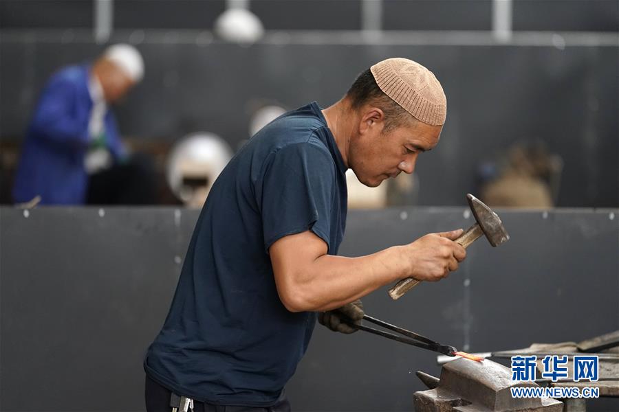 8月10日,甘肅省臨夏回族自治州積石山縣大河家鎮(zhèn)的村民在制作保安腰刀。新華社記者邢廣利攝。