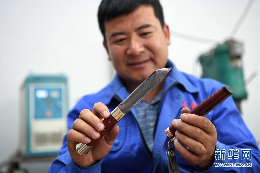 8月10日,在甘肅省臨夏回族自治州積石山縣大河家鎮(zhèn),國(guó)家級(jí)非物質(zhì)文化遺產(chǎn)代表性項(xiàng)目保安族腰刀鍛制技藝傳承人馬尕主麻在查看一把鍛制好的保安腰刀。新華社記者陳斌攝。