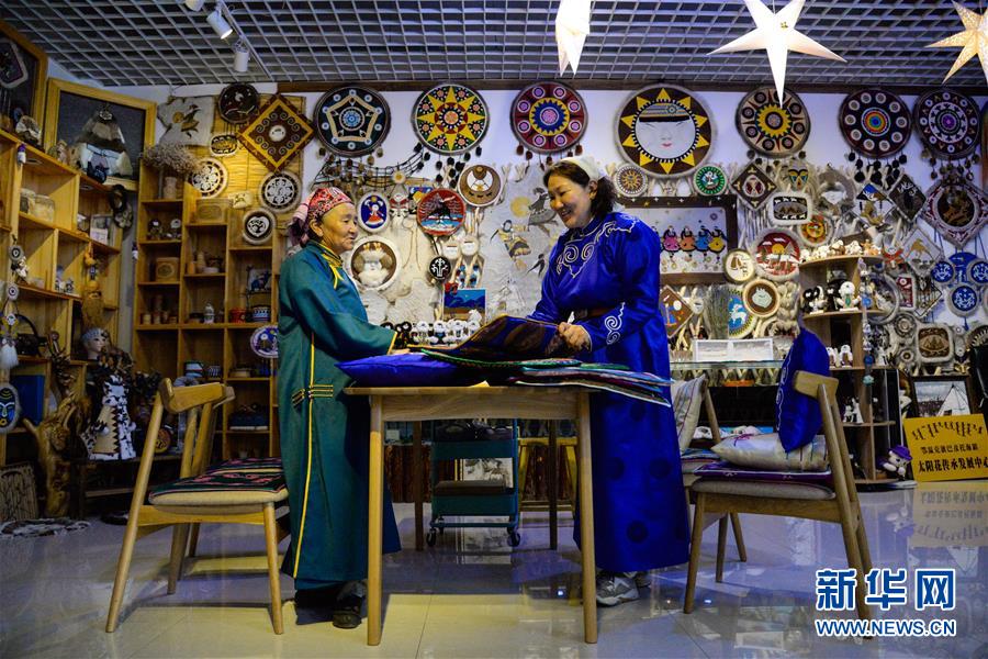 在內(nèi)蒙古自治區(qū)鄂溫克族自治旗巴彥托海鎮(zhèn)太陽(yáng)花傳承發(fā)展中心,脫貧戶敖登圖雅(左)向?yàn)跞式桓蹲约褐谱骱玫氖止に嚻罚?月6日攝)。新華社記者徐欽攝。