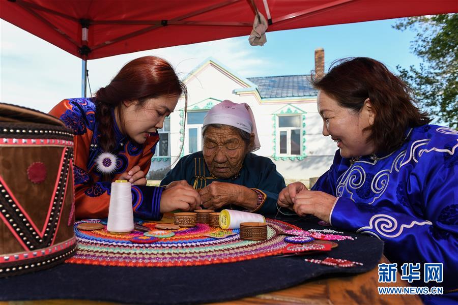 在內蒙古自治區(qū)鄂溫克族自治旗伊敏蘇木的老家,艾吉瑪(左)在向姥姥水機花(中)、母親烏仁(右)學習太陽花制作工藝。(8月6日攝)。新華社記者劉磊攝。