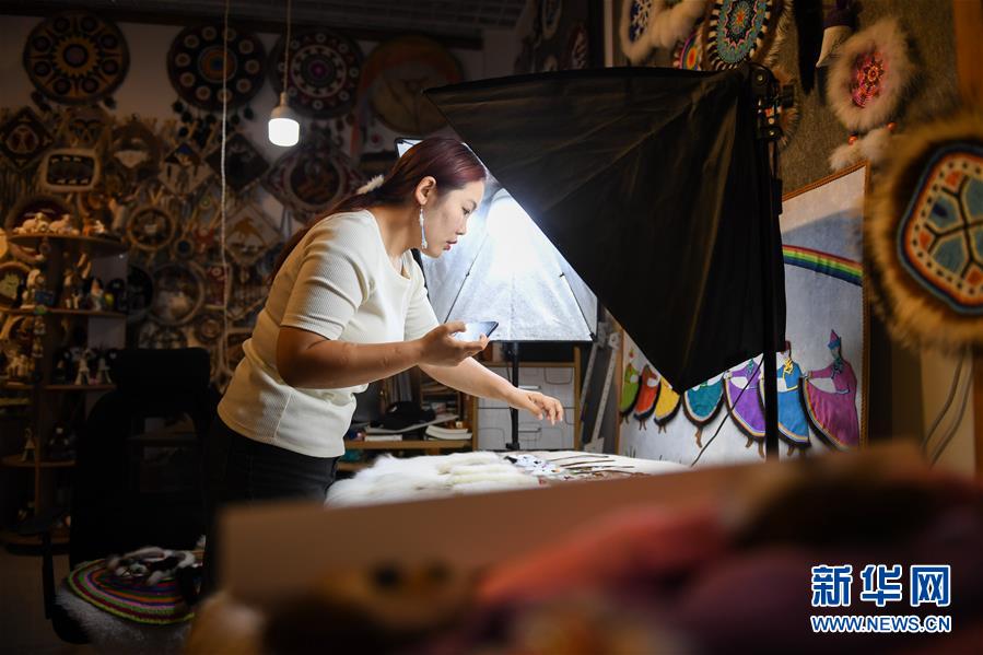 在內(nèi)蒙古自治區(qū)鄂溫克族自治旗巴彥托海鎮(zhèn)太陽花傳承發(fā)展中心,艾吉瑪在拍攝手工藝品照片(8月7日攝)。新華社記者劉磊攝。
