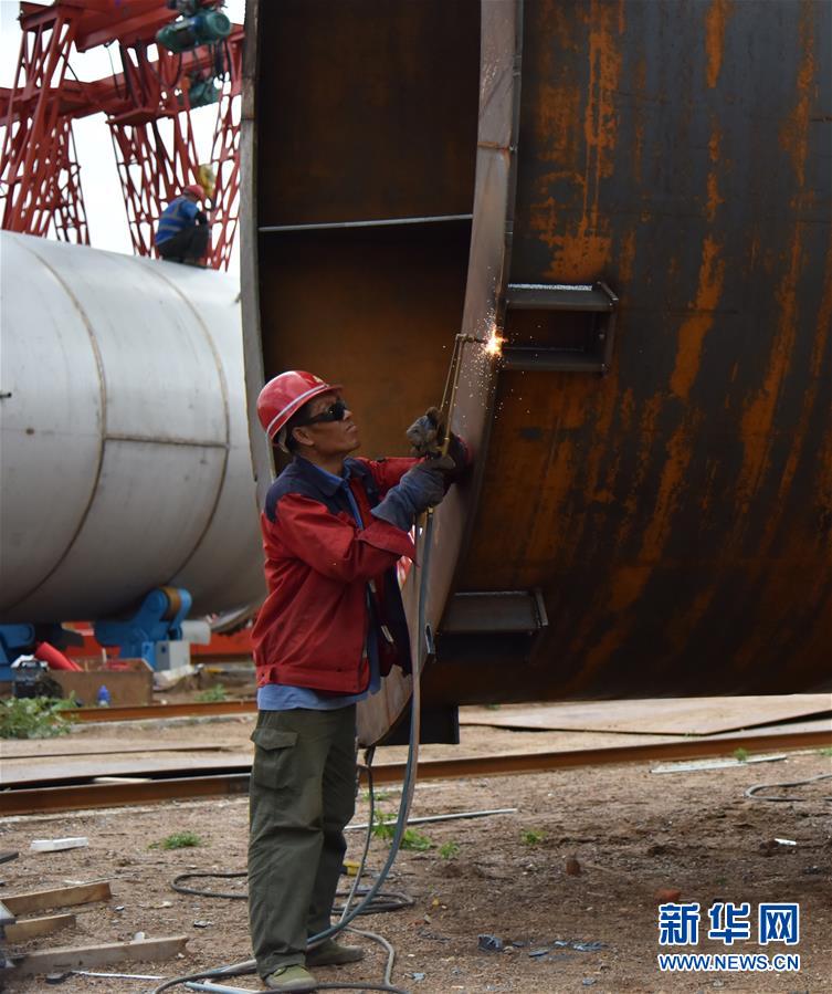在黑龍江省訥河市華瑞生物醫(yī)藥項(xiàng)目焊接現(xiàn)場,工人在焊接發(fā)酵罐(8月4日攝)。新華社記者梁冬攝。