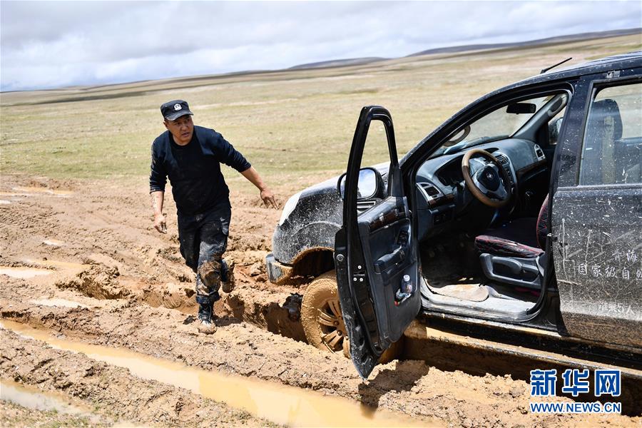 7月6日,卓乃湖保護(hù)站站長(zhǎng)秋培扎西查看陷車情況。新華社記者張龍攝