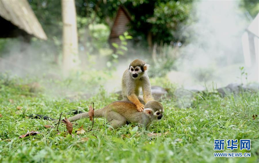 8月11日,上海動物園的松鼠猴在“地噴”營造的水霧中玩耍。當日,上海最高溫度達到35攝氏度,上海動物園開啟園內安裝的各種噴淋裝置,讓動物們防暑降溫,樂享清涼。新華社記者張建松攝